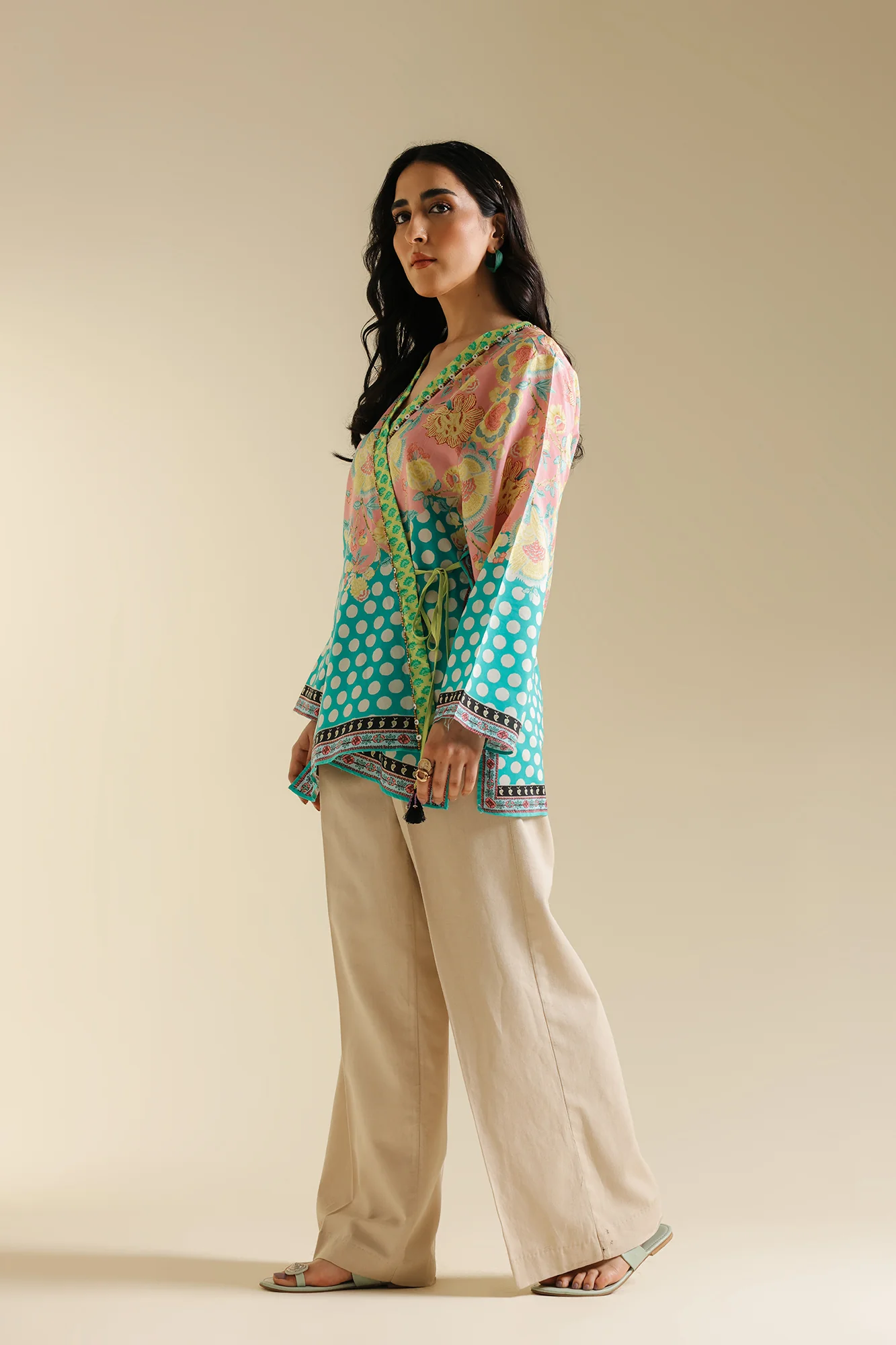 Look classically chic in this style statement outfit illustrating a contemporary front open kimono silhouette. Rendered in a mesmerizing baby pink shade, this enchanting floral printed canvas is adorned with beautifully enhanced with dazzling beads embellishments and dori and tassels at front. This alluring outfit is a great option for fun gatherings and resonate the true boho spirit.