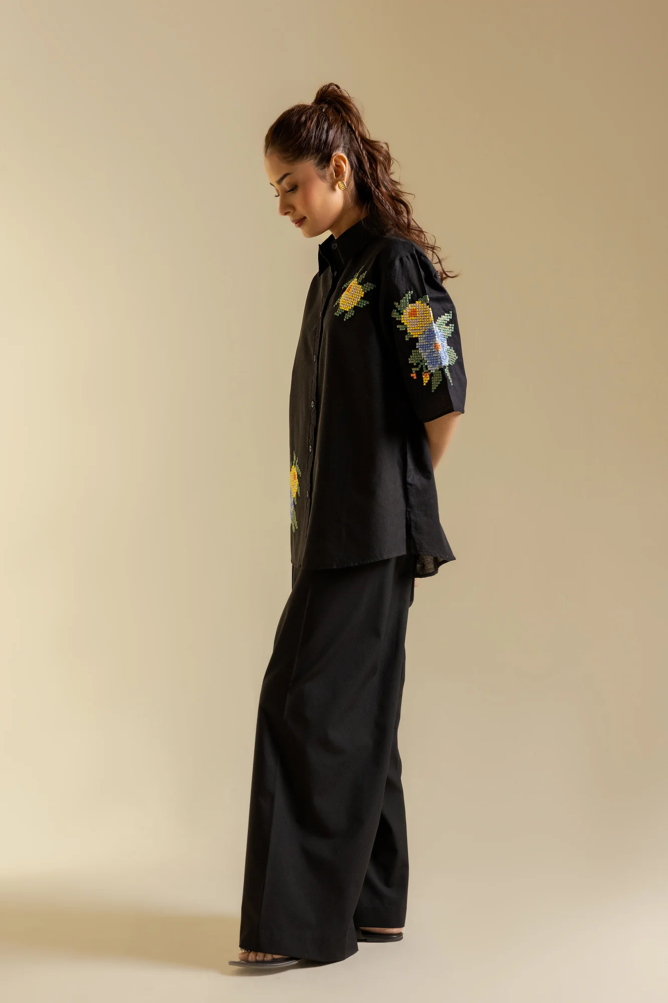 Embrace your inner grace and sophistication with this classy shirt rendered in a bold black shade. Featuring a modern button down silhouette and enriched with beautiful floral embroidery in vibrant colors illustrating cross stitch technique. Perfect for adding a touch of fun to your wardrobe this season!