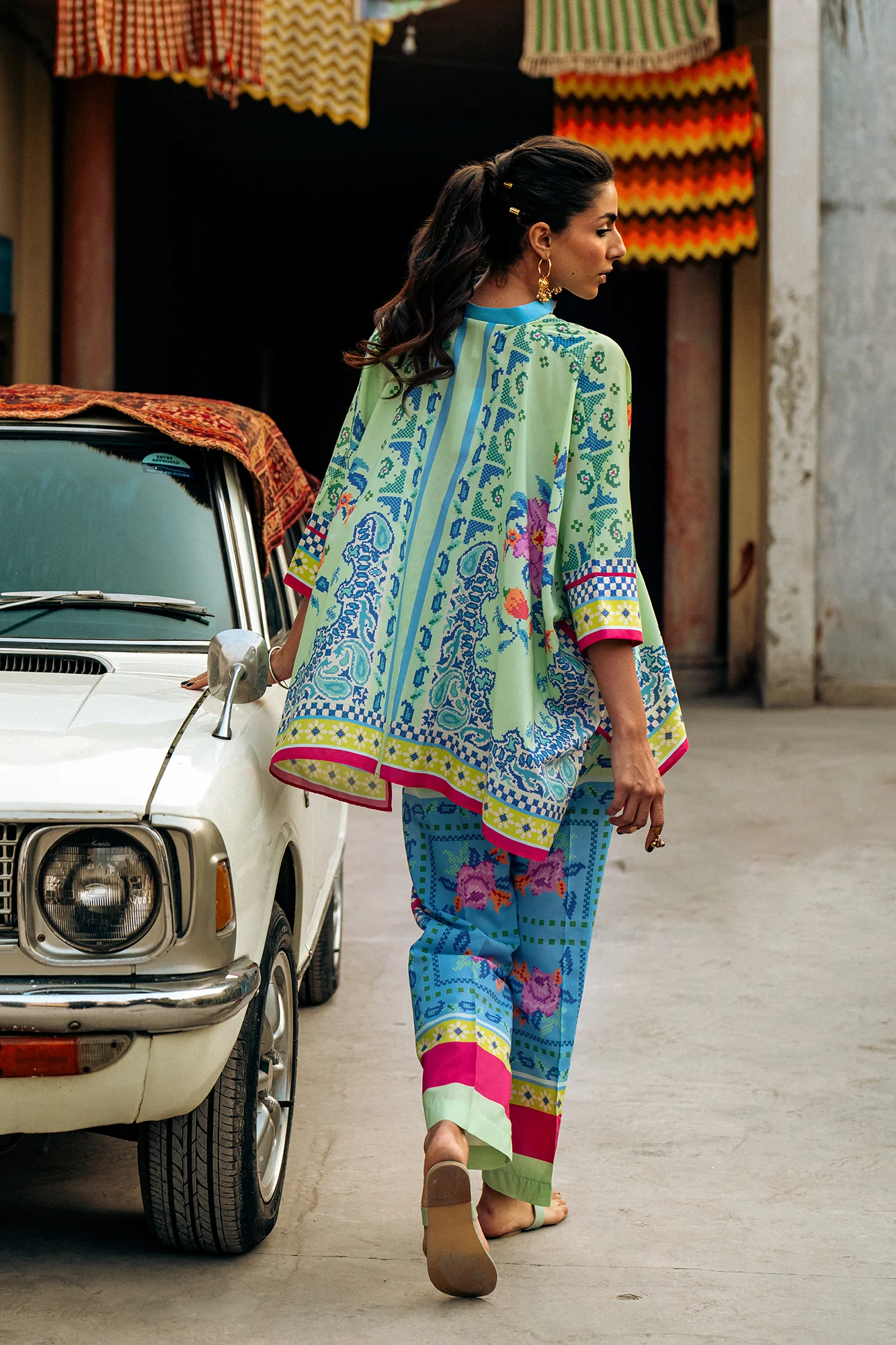 A contemporary composition is layered on this trendy button down kimono silhouette beautifully adorned with captivating artistic prints in vibrant colors portrayed on a luscious green canvas. Paired with a matching trouser, this style statement outfit is a perfect option for you to embrace this summer season.