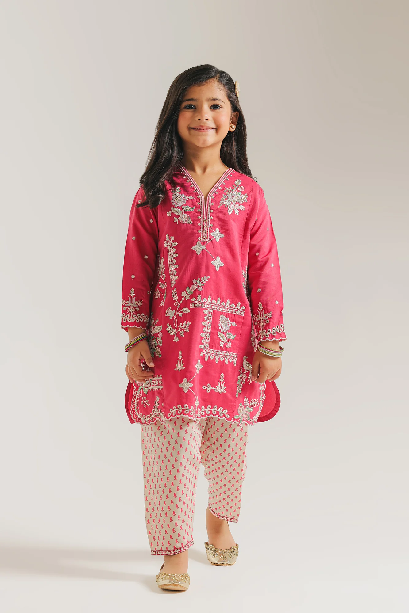 This striking magenta embroidered suit for girls is a vibrant celebration of playful elegance and artisanal detail, making it an enchanting choice for festive occasions. The long-sleeved tunic features a rich pink canvas meticulously adorned with intricate floral embroidery that dances across the bodice and hemline. Designed with a sophisticated V-neckline and delicate scalloped edges, the shirt is perfectly paired with cream-colored trousers featuring a charming all-over pink polka-dot pattern. Crafted with a comfortable, relaxed silhouette, this ensemble offers a joyful burst of color and a refined finish that ensures she feels both stylish and spirited at every celebration.