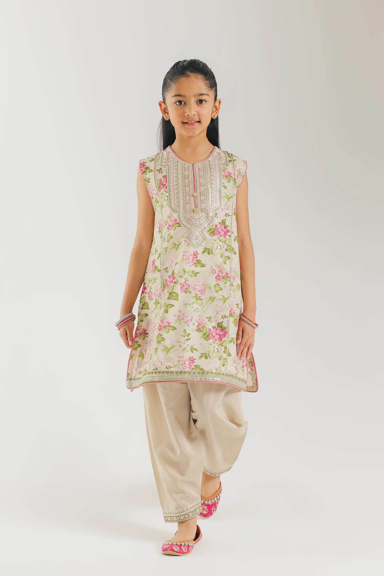 This elegant sleeveless kurta showcases a delicate all-over floral print in rosy pink and sage green tones on a light cream base. The standout feature is the intricately embellished neckline adorned with silver Gota Patti and sequin work, creating a striking bib effect that catches the light beautifully. Complementary silver lace and pink piping detail the hem and side slits, adding refined sophistication. Paired with coordinating cream shalwar pants, this ensemble balances ornate detailing with understated elegance, making it ideal for festive occasions or formal gatherings.