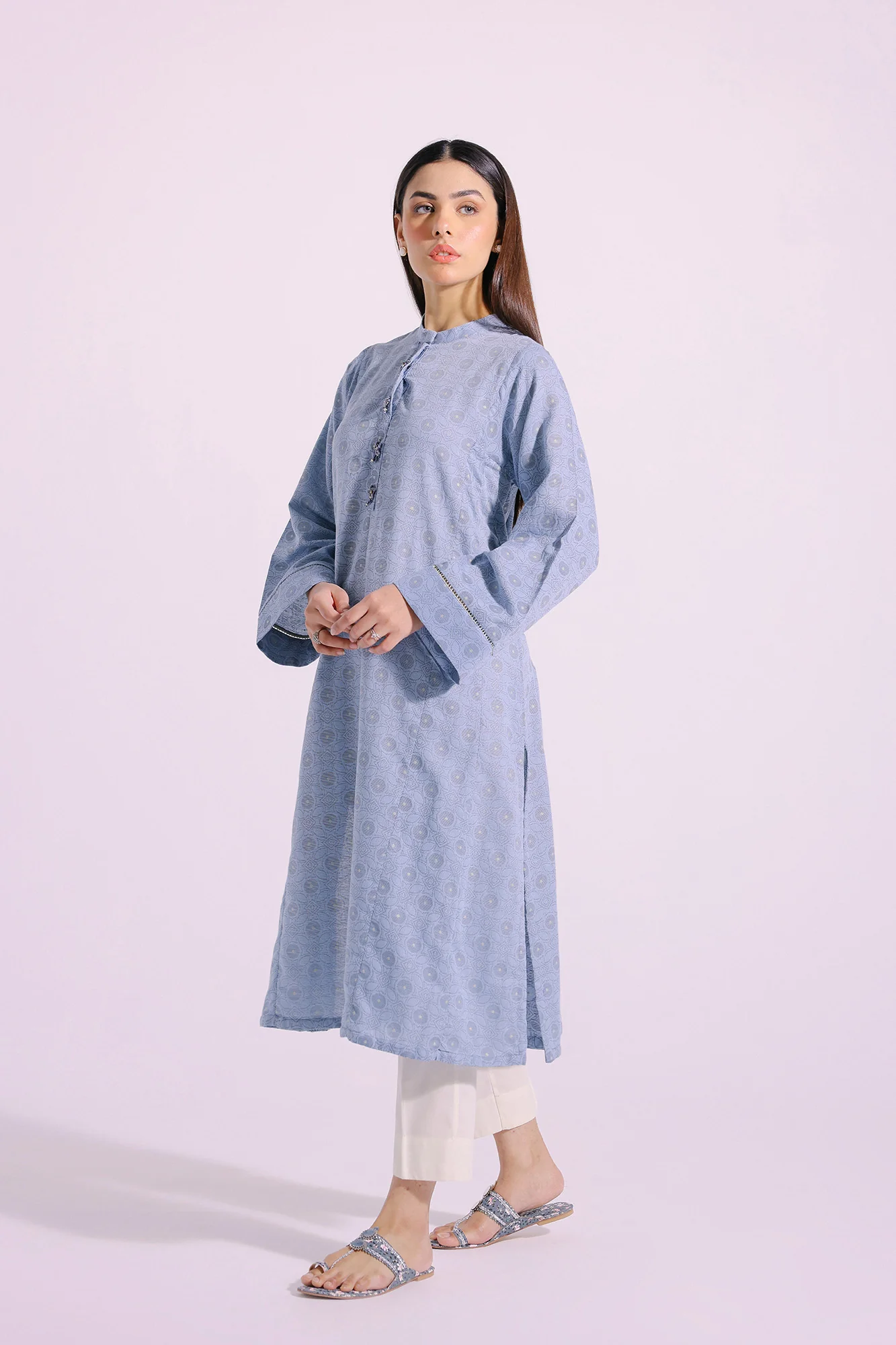 This style statement shirt is the perfect addition to your wardrobe. Crafted from a classy, refreshing light aqua fabric, it features a classy silhouette shirt adorned with geometric pattern canvas and embellished with scintillating beads at front placket, guaranteeing a dazzling look with its contemporary design.