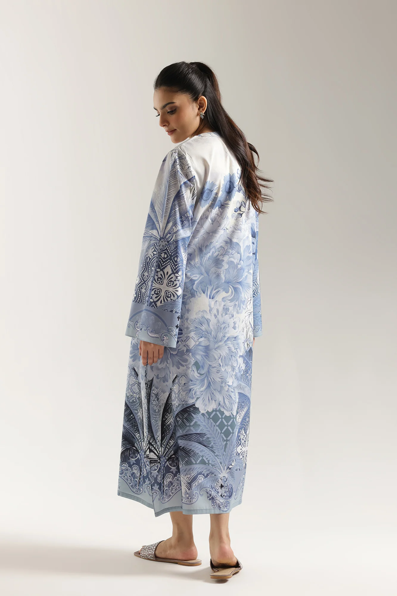 A refined long shirt in creamy coconut milk hue, adorned with an intricate blue print that adds visual interest. This piece features a classic round neckline with a graceful V-slit, complemented by two decorative tassels at the front for an authentic touch. The full-length sleeves provide coverage and elegance, making this shirt versatile for layering or standalone wear. The contemporary styling, suitable for casual occasions.