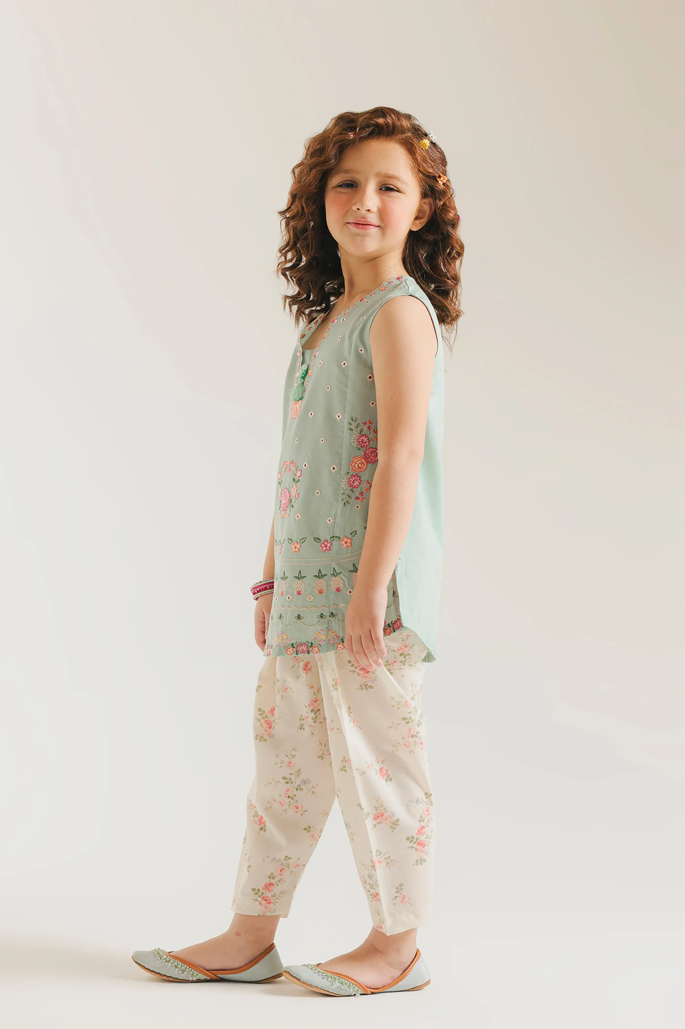 A serene and refined ensemble that captures effortless elegance. The sleeveless mint green kurta features a delicate slit neckline and intricate embroidery in soft pink and green florals. At the same time, detailing along the hem creates an airy, breathable quality. Paired with cream-toned tulip trousers adorned with complementary pink floral prints, this coordinated set achieves a harmonious balance between traditional craftsmanship and contemporary design. The thoughtful color palette and layered embellishments reflect meticulous attention to detail, making it an ideal choice for those who appreciate understated sophistication and artisanal beauty.