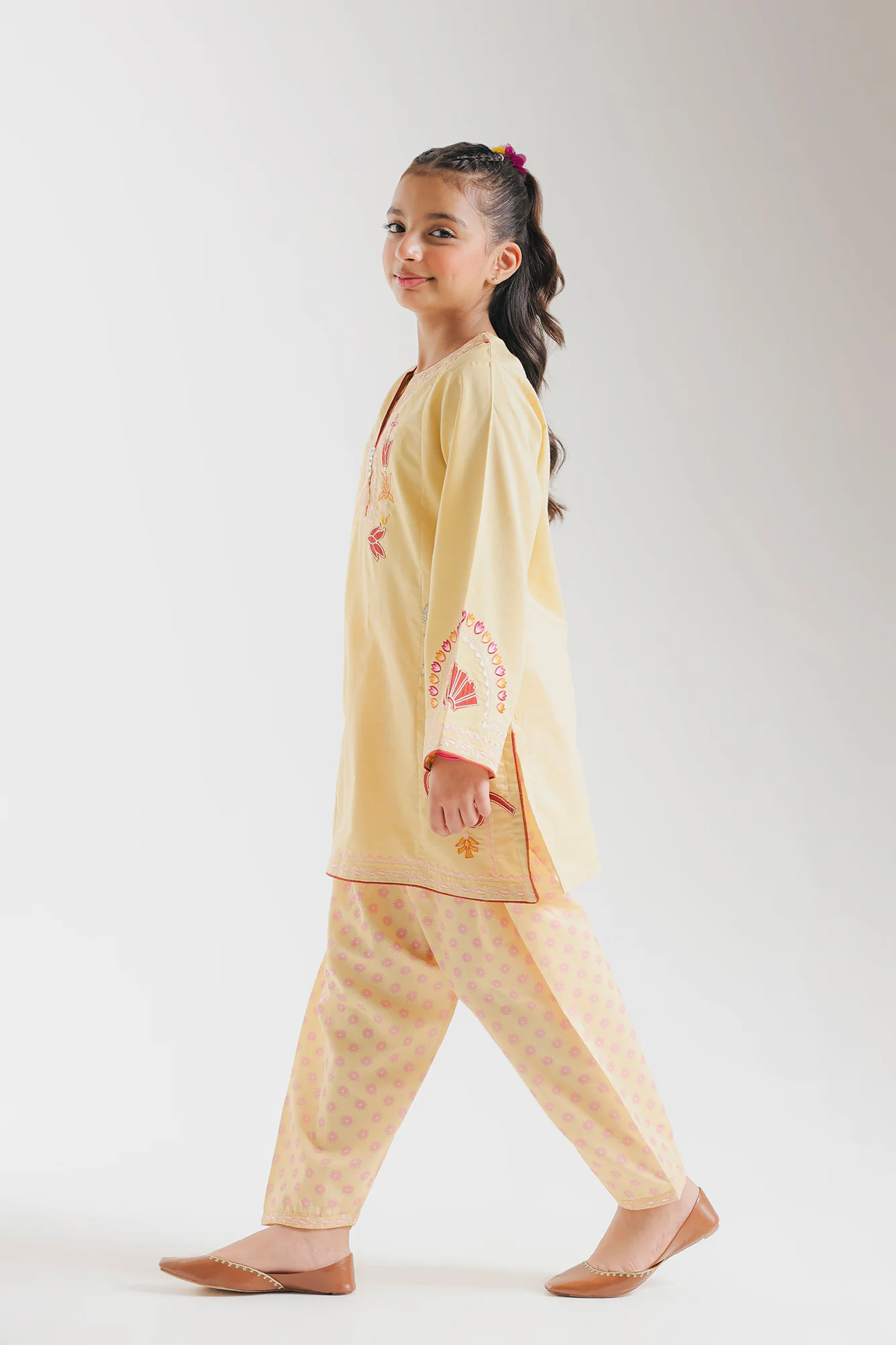 Designed with both comfort and elegance in mind, this children's ensemble features a soft buttery yellow kurta. The round neckline with subtle V-slit is adorned with a delicate tassel, while intricate floral and geometric embroidery in warm rust, pink, and orange tones creates a charming spray pattern on the chest and ornate semi-circular borders on the voluminous sleeves. The coordinating tapered shalwar showcases a gentle all-over polka dot or small floral print in complementary pinkish-orange, adding visual interest while maintaining ease of movement. A thoughtfully crafted piece that balances traditional artistry with practical comfort for young wearers.