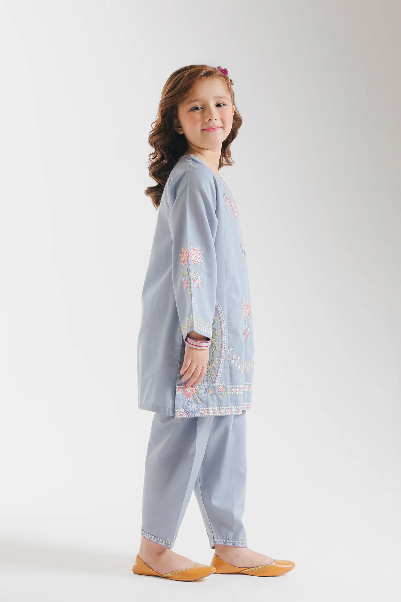 This ensemble features a straight-cut kurta adorned with exquisite floral embroidery in soft pink, coral, and white. The design concentrates its intricate detailing around the neckline, center panel, and hemline, creating a refined focal point. Fashionable bell sleeves with coordinating cuff embroidery add modern movement and visual interest, while the matching straight-leg trousers feature delicate lace detailing at the hem that echoes the kurta's embellishment. This thoughtfully proportioned pairing celebrates traditional craftsmanship through a contemporary lens, perfect for those seeking polished sophistication with current-season appeal.