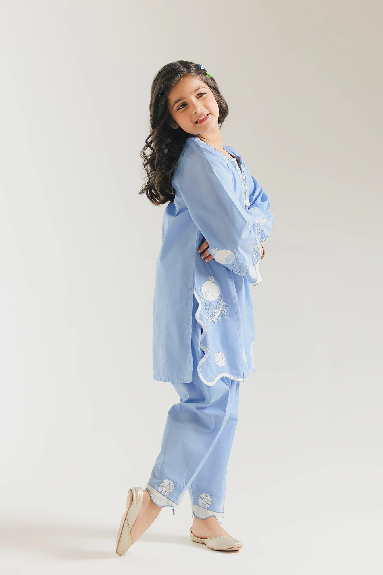 Radiate a serene charm with this enchanting sky-blue embroidered suit for girls. The long-sleeved tunic features a sophisticated split neckline with a delicate tassel-tie detail and elegant scalloped edges at the hem and wide sleeves. Exquisite ivory floral embroidery and circular motifs adorn the bodice and cuffs, blending playful design with traditional craftsmanship. Paired with coordinating shalwar featuring matching embroidered borders at the ankles, this ensemble offers a graceful and polished silhouette. It is the perfect choice for stylish daytime gatherings or festive celebrations for your young fashionista.