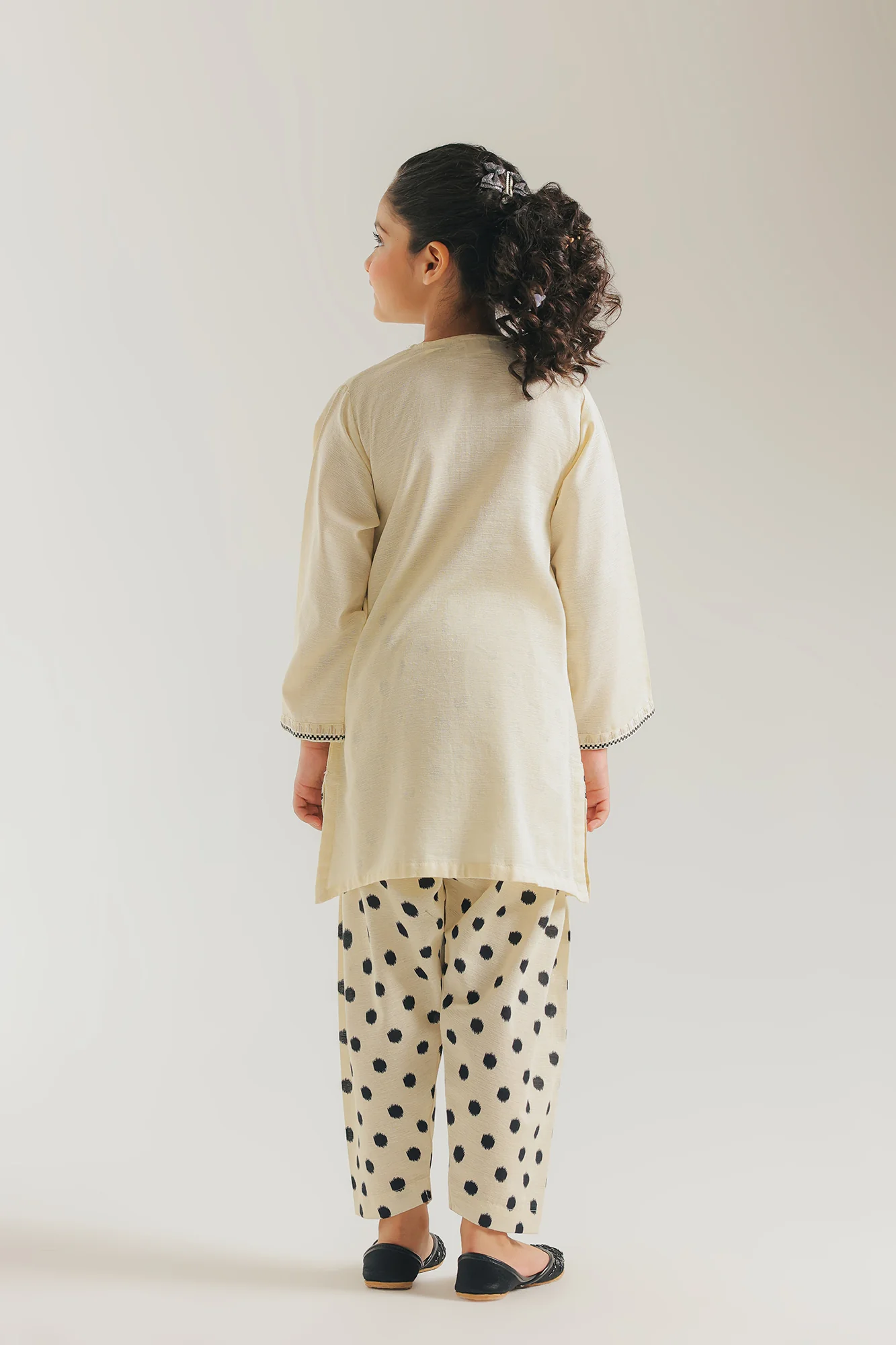 Elevate your wardrobe with this sophisticated two-piece ensemble. The ivory silk tunic features a striking circular sunburst embroidery on the chest, complemented by intricate black floral vine detailing along the sides and hem. A round neckline with contrasting black piping and delicate tassels adds refined charm. Pair it with the relaxed tapered trousers, adorned with a bold black polka dot pattern for a modern, high-contrast look. Perfect for both casual gatherings and special occasions.