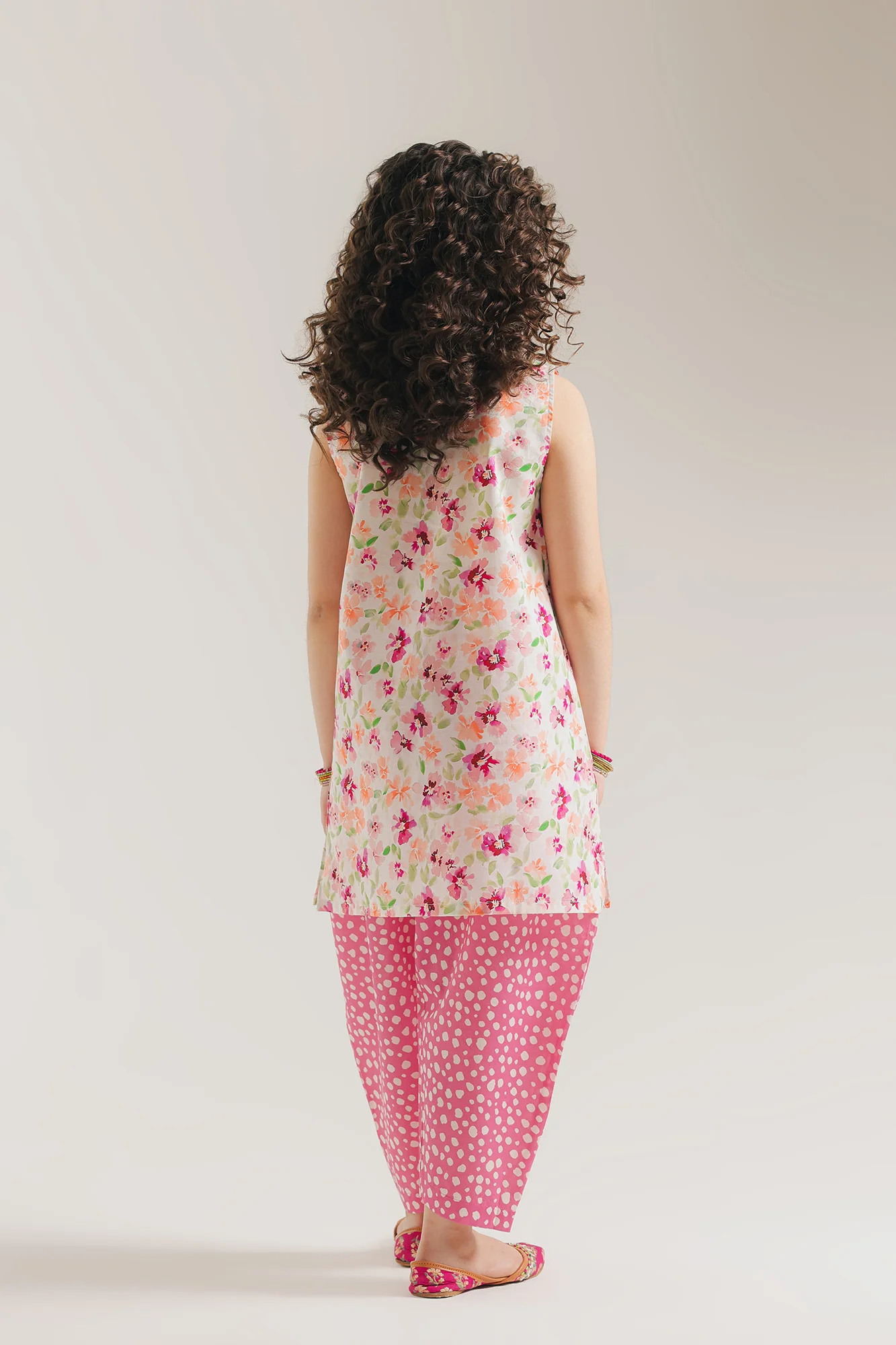 Bring a splash of garden-fresh color to her festive wardrobe with this delightful Ivory and pink two-piece printed suit. The sleeveless tunic is crafted on a crisp white base, featuring a vibrant all-over floral print in cheerful shades of peach, magenta, and leaf green. The design is elevated by a sweet pink-piped V-neckline adorned with a row of dainty pearl button accents, adding a touch of classic refinement. Adding a playful and modern twist, the shirt is paired with hot pink polka-dot tulip shalwar, creating a high-contrast and energetic silhouette. Perfect for sunny outdoor celebrations or festive family gatherings, this ensemble ensures she stays comfortable while looking effortlessly charming.