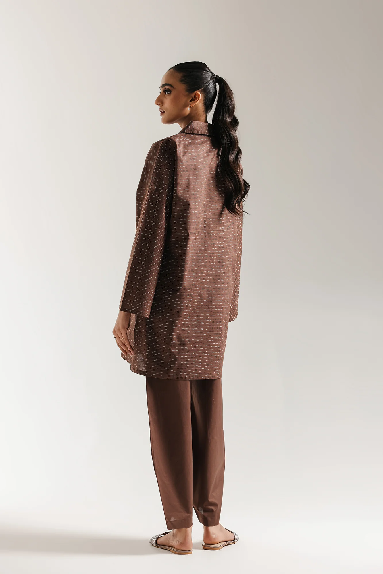 Embrace earthy tones and subtle texture with this stylish khaki solid suit. The relax fit kurti is crafted from a rich brown fabric with a delicate tonal striped texture, and features a classic collar. The unique appeal is further enhanced by an eye-catching dori accent with tassels adorning the neckline. Complementing the kurti is a coordinating comfy trouser in a solid khaki brown, creating a cohesive and elegantly modern traditional look perfect for sophisticated daily wear.