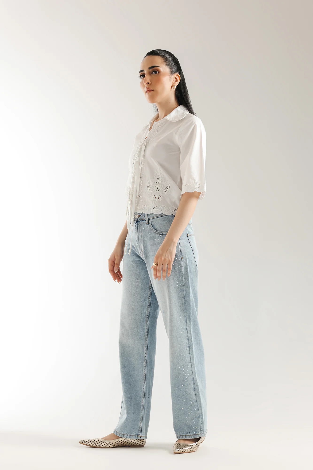 Elevate your everyday style with this charming white shirt. Crafted from light and breathable fabric, it features delicate eyelet details that add a touch of feminine elegance. Pair this versatile top with your favorite bottoms for a fresh and effortlessly chic look.