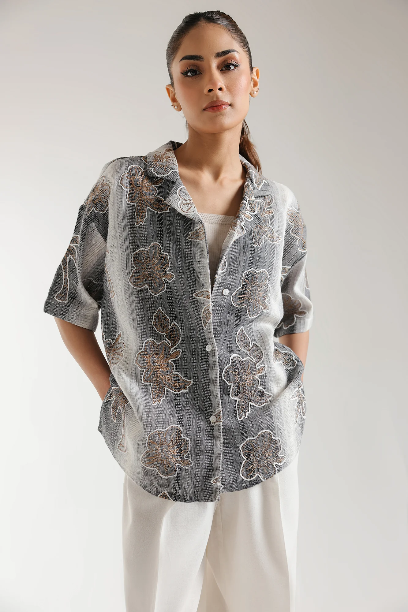 This modern shirt features a stylish design in a captivating off white color. With a sophisticated button down silhouette and an attractive white grey textured canvas, it showcases a refined design embroidered with contrasting white and brown floral designs. Ideal for wearing to any fun events this season.