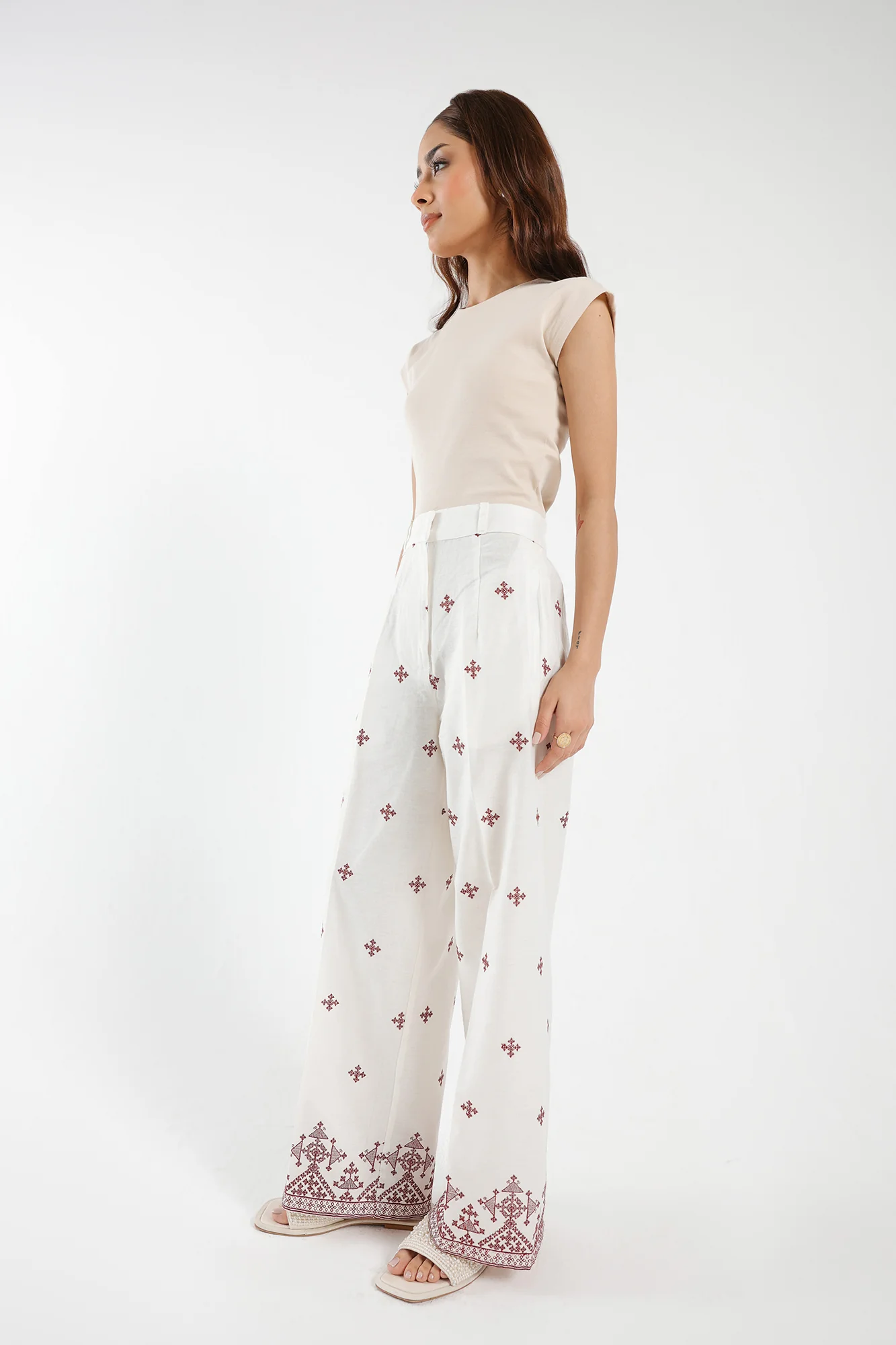 A classically chic design is portrayed on this contemporary trouser rendered in a celestial white shade. Crafted in a contemporary silhouette with pleats and adorned with intricate embroidery illustrating traditionally rich geometric designs in deep maroon hues, this style statement trouser is a must have to embrace at happening occasions and look elegant this season.