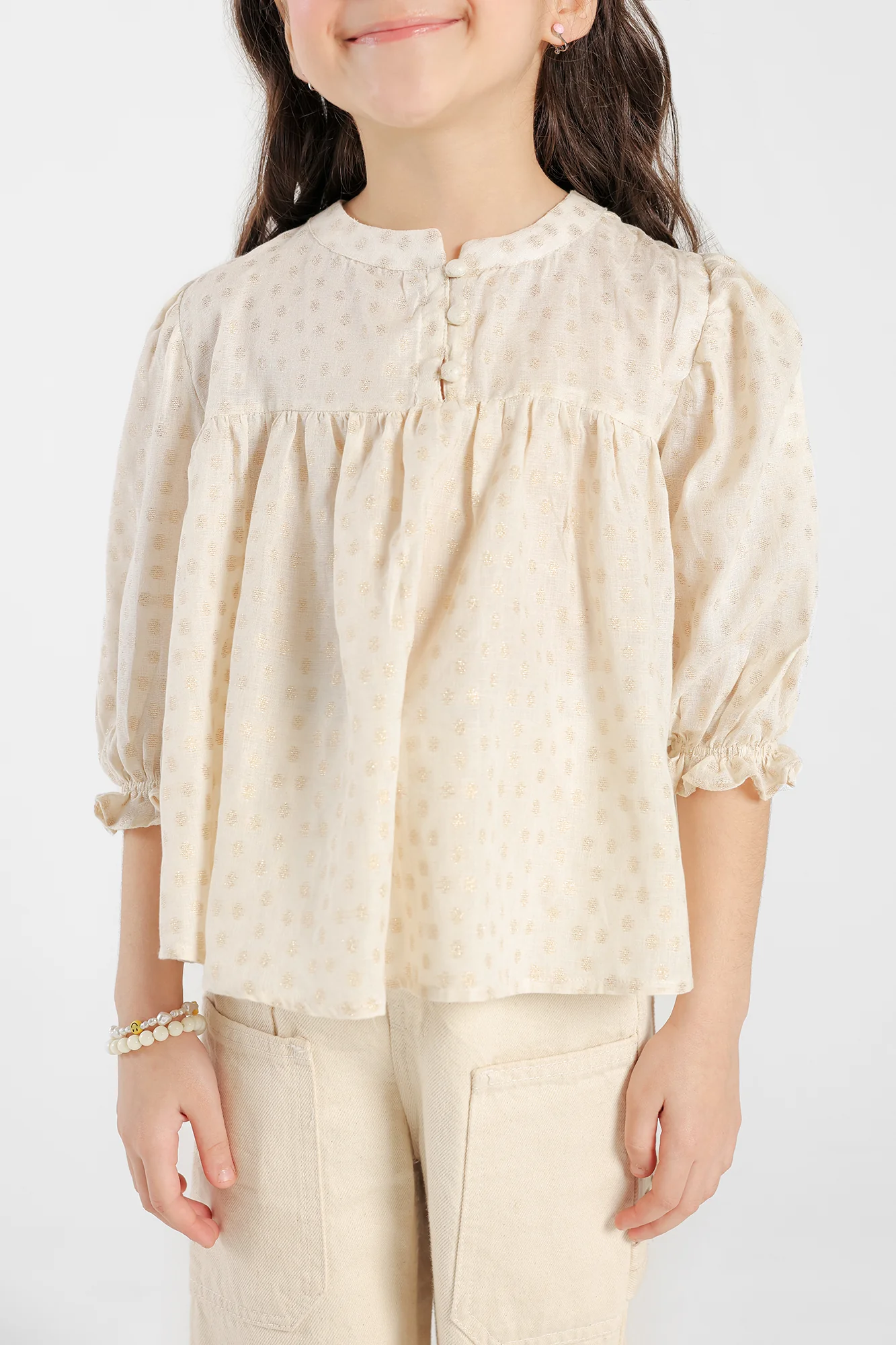 This enchanting top combines classic elegance with modern design elements. Its fascinating peplum silhouette is perfect for kids to style at fun occasions. Rendered in coconut milk hue and enriched with scintillating details, this trendy top will be a stylish statement for any occasion.