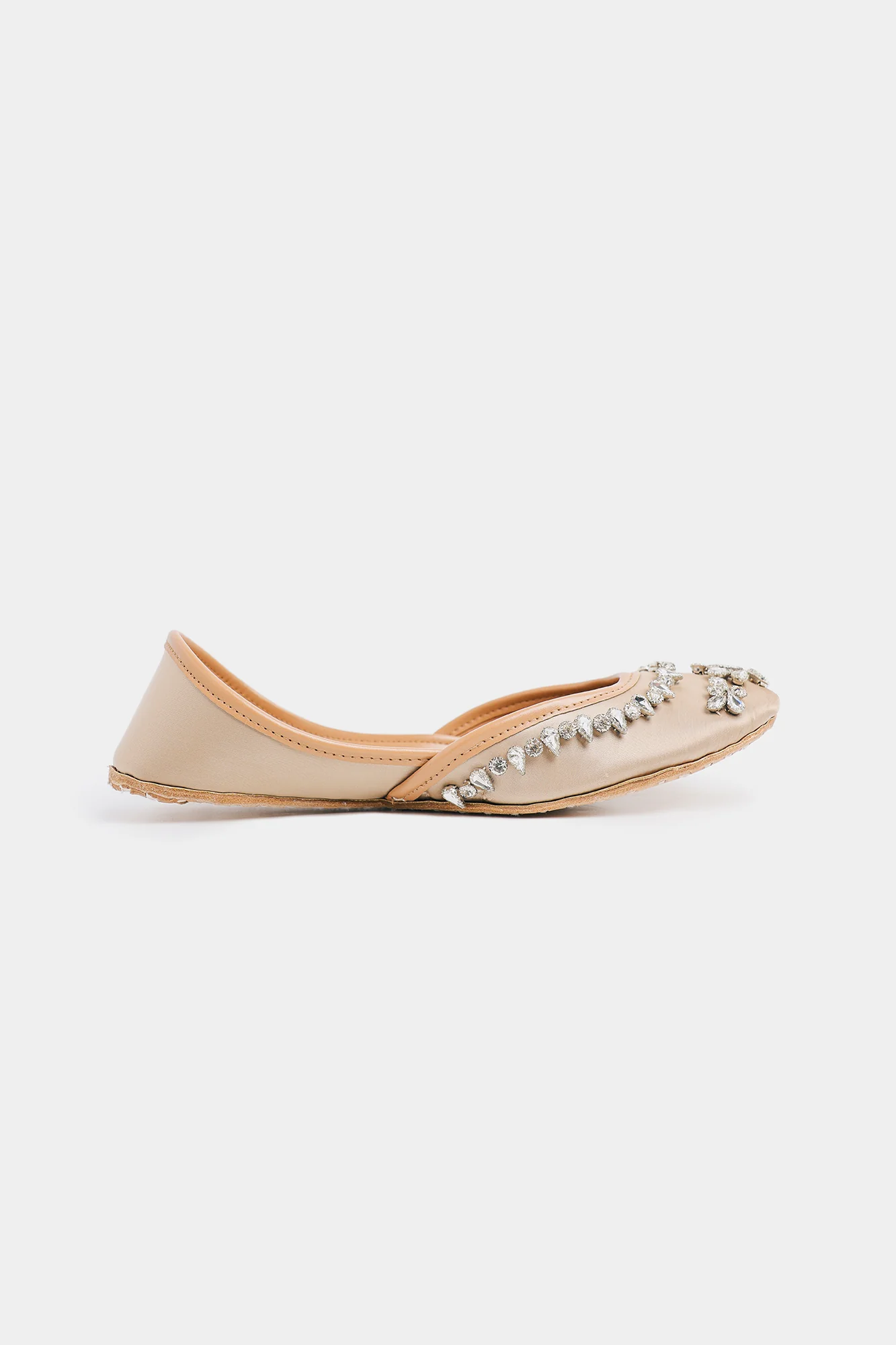 Elevate your ethnic wardrobe with this meticulously handcrafted khussa, where traditional artistry meets contemporary sophistication. Adorned with intricate crystal and bead embellishments set against a refined neutral palette, this pair delivers understated glamour perfect for weddings, celebrations, and formal occasions. The thoughtfully engineered cushioned insole provides all-day comfort, while the timeless silhouette ensures a secure, flattering fit that complements traditional and fusion ensembles alike.