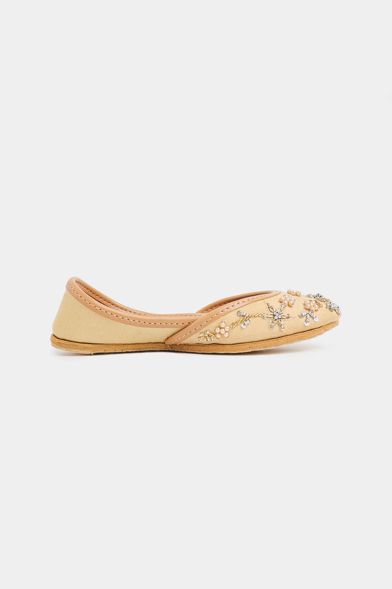Elevate your kid's festive wardrobe with these exquisite handcrafted Khussas, where traditional artistry meets modern sophistication. The soft beige upper, crafted from luxurious textured fabric, serves as the perfect canvas for stunning 3D floral embellishments. Adorned with delicate ivory pearls, shimmering gold and silver work, sequins, and sparkling crystal accents, each pair showcases meticulous craftsmanship. Versatile enough for formal occasions or celebratory events, these Khussas combine timeless elegance with contemporary flair, making them an essential addition to your Kids collection.