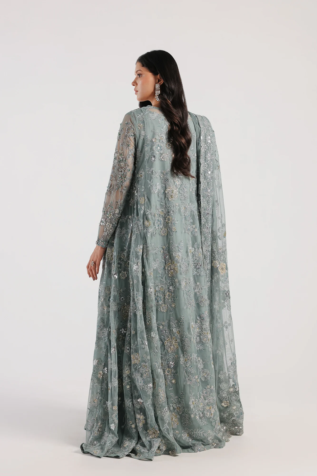 Look breathtakingly beautiful in this mesmerizing light sea green outfit. Crafted in a contemporary pishwas silhouette with round neck, it features beautiful floral embroidery in scintillating colors and enhanced with sequins and beads embellishments. Divinely gorgeous, the chic shirt is paired with a graceful inner shirt and a classically draped embroidered dupatta with scalloped borders - you can't help but feel like a diva in this fairytale ensemble to style at festive events.