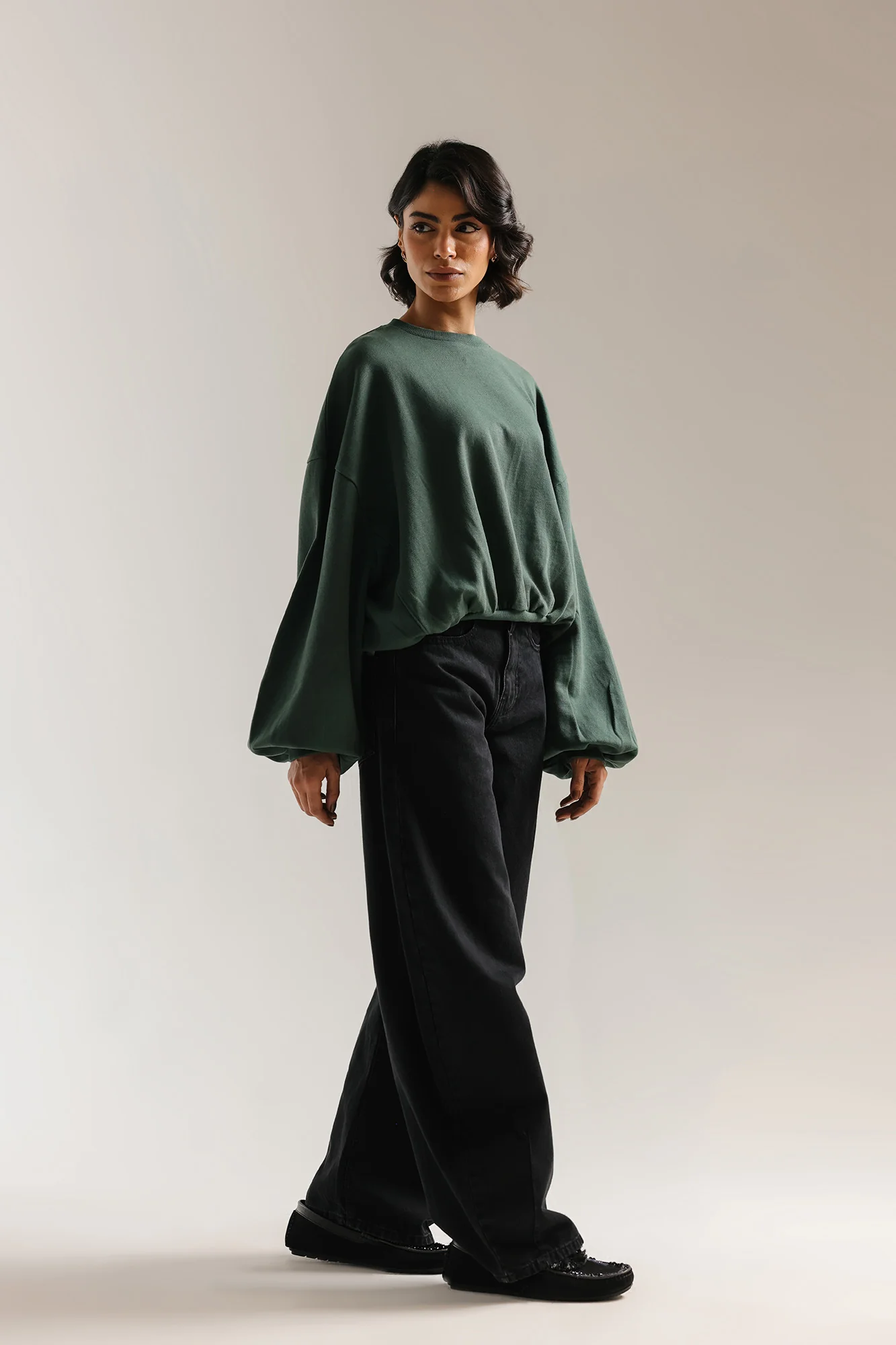 Exude an effortless, modern vibe in this deep forest green sweatshirt, featuring a relaxed, oversized silhouette that prioritizes both comfort and style. The design is characterized by its voluminous balloon-style sleeves and a uniquely elasticated hemline that creates a subtle, gathered effect at the waist. This minimalist piece is crafted with a simple rounded neckline and clean lines, making it a versatile staple for any contemporary wardrobe.