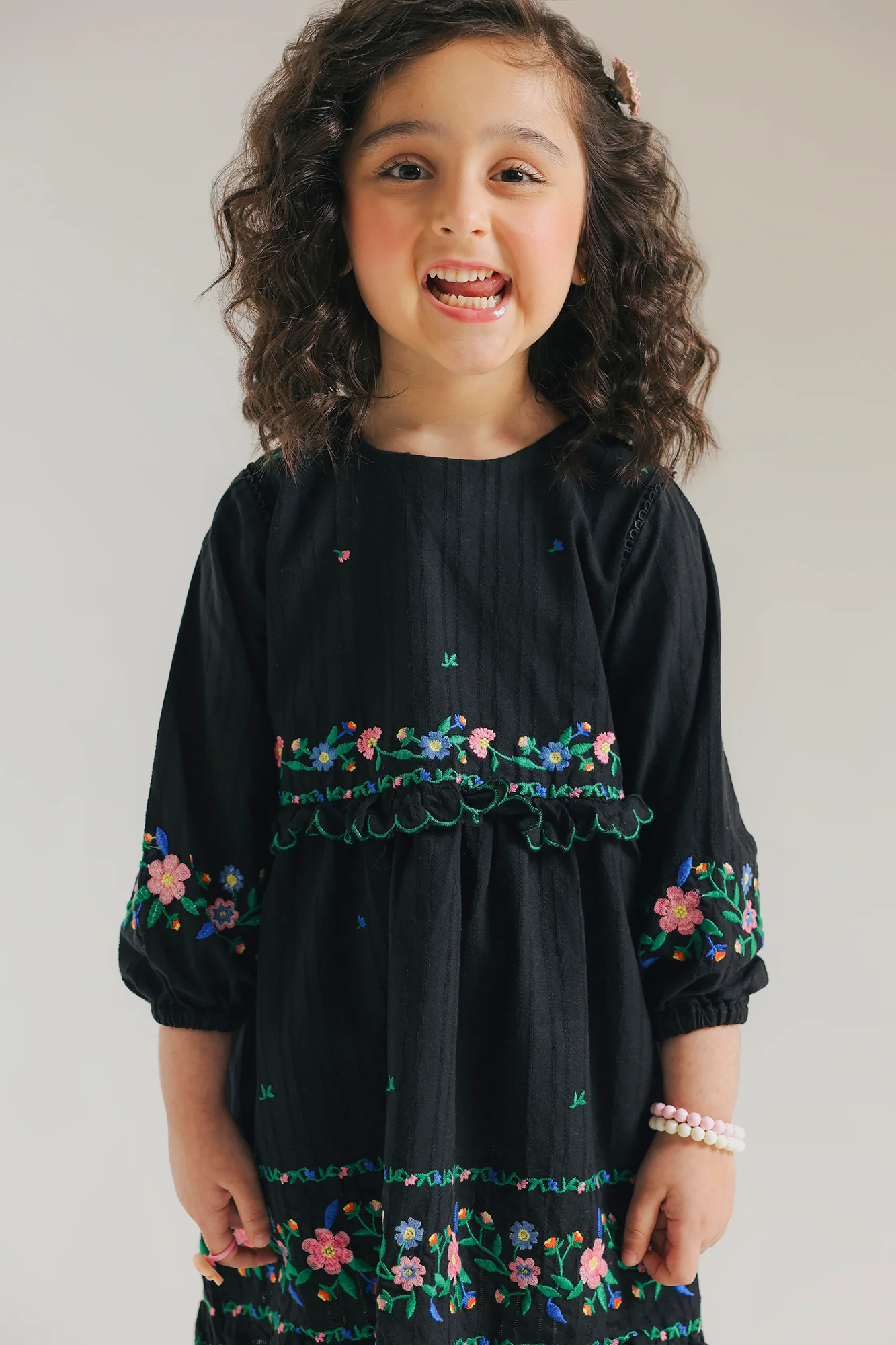 Let her shine in this enchanting black floral embroidered mini dress. Designed with a perfect blend of sweetness and sophistication, this dress is crafted from a soft, dark-textured fabric that provides a comfortable yet polished fit for any special occasion. The dress features a charming round neckline and long sleeves, beautifully highlighted by vibrant floral embroidery in shades of rosy pink, cornflower blue, and meadow green. Intricate embroidered bands define the waist, sleeve cuffs, and the skirt, creating a playful and voluminous silhouette. A delicate ruffled hemline adds a final touch of feminine flair, making it an ideal choice for festive gatherings or a polished day out.
