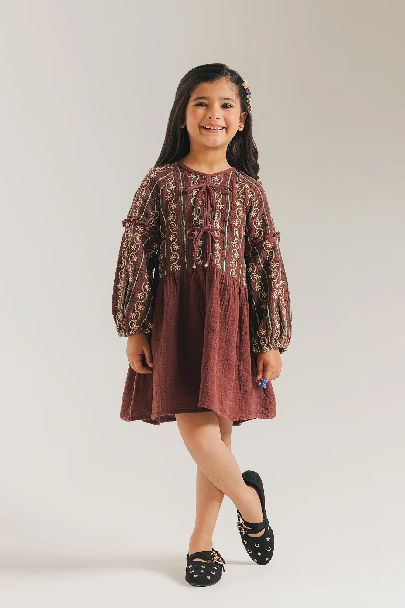 Invite a touch of artisanal elegance into her wardrobe with this enchanting dress, rendered in a rich, earthy cocoa brown hue. The upper bodice and voluminous sleeves are beautifully adorned with intricate vertical floral embroidery in soft, contrasting tones, lending a sophisticated bohemian feel to the design. A delicate double-tie detail at the neckline adds a sweet, feminine touch, while the gathered waist flows into a textured, crinkled-fabric skirt that is designed for comfort and effortless movement. With its relaxed silhouette and stylish puff sleeves, this dress is the perfect choice for creating a look that is both grounded and gracefully chic.