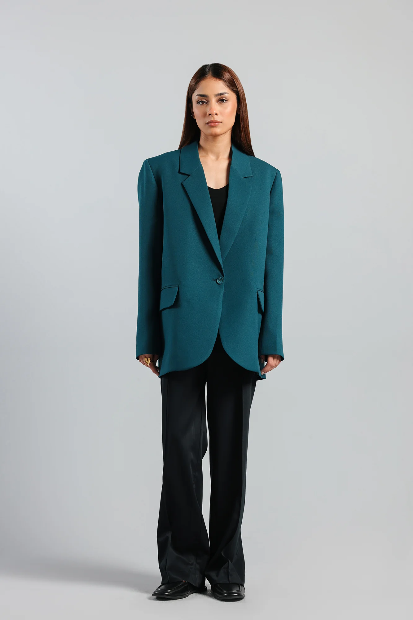 A gracefully chic composition is layered on this elegant blazer rendered in a mesmerizing teal shade. Crafted in a classy silhouette with button closure at front and adorned with flap pockets, this style statement blazer is a must have to be the epitome of perfection this winter season.