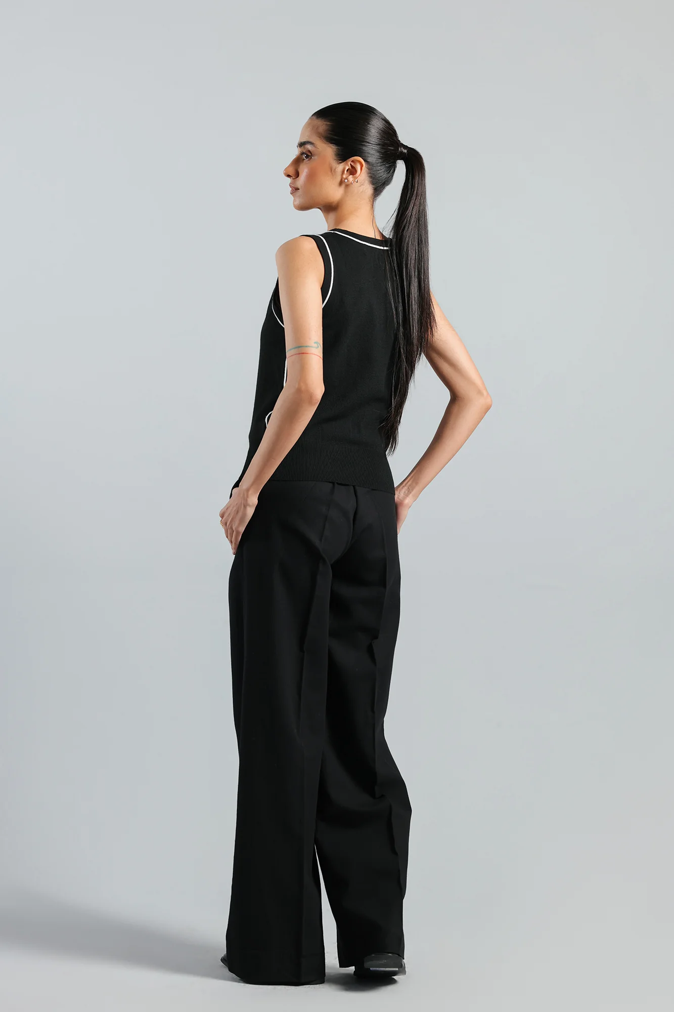 As a versatile addition to your wardrobe, our black vest style sleeveless sweater offers timeless style and endless pairing options. The sleek and sophisticated design provides a touch of elegance to any outfit, making it a must-have piece for any fashion-forward individual.