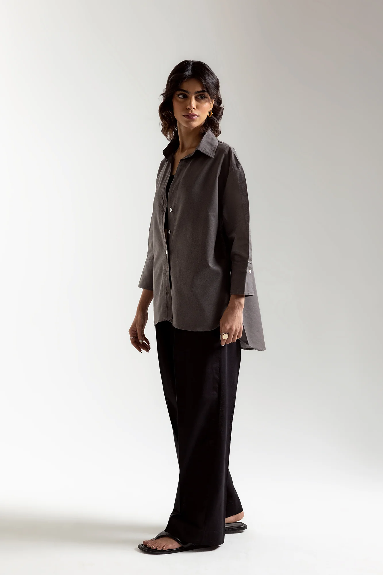 Effortlessly chic and stylish, this lightweight button down top boasts a beautiful anthracite grey color and intricate design. crafted in a trendy textured fabric and quarter sleeves, this modern piece is perfect for any upcoming fun occasion. Elevate your wardrobe with this trendy top.