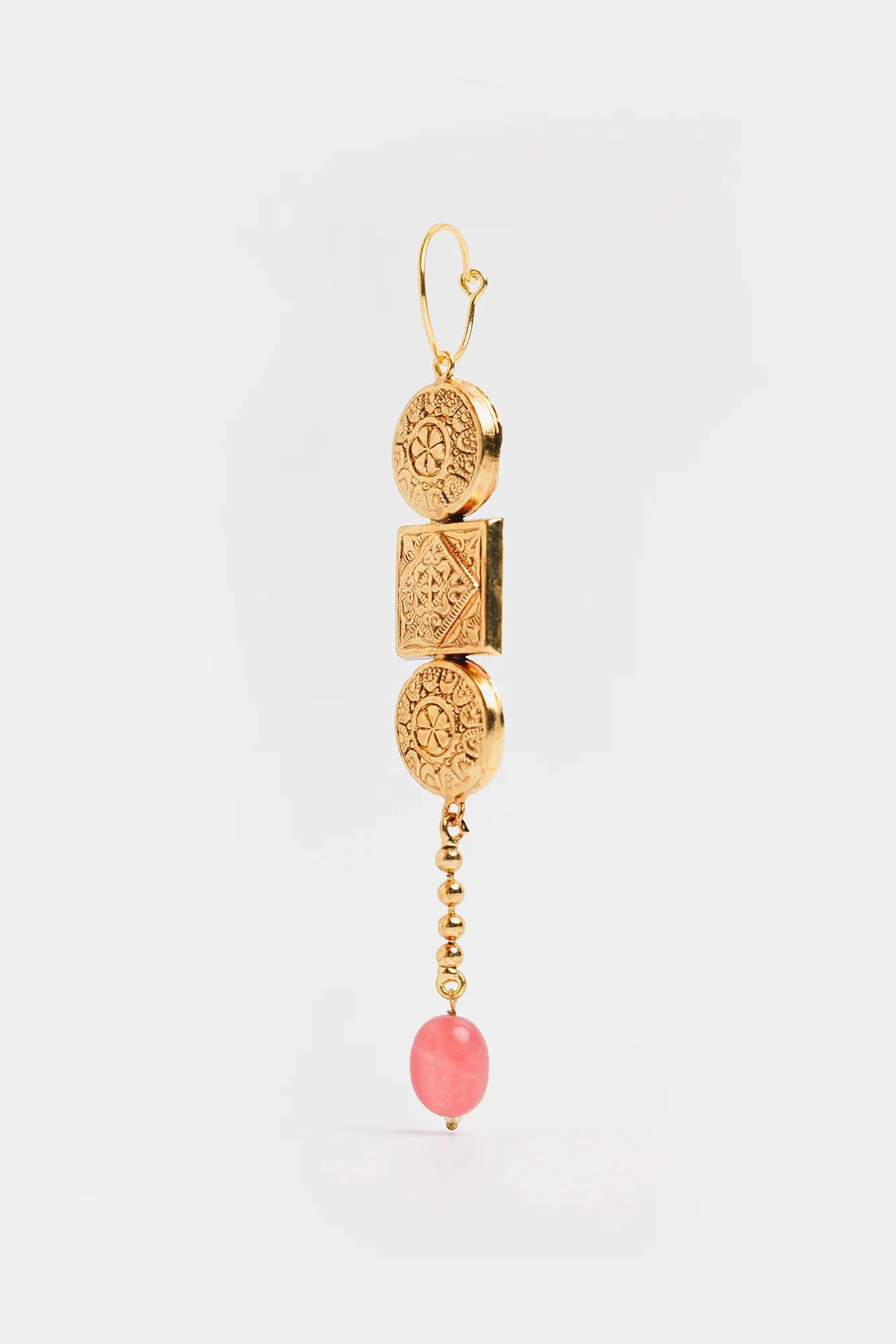 The design features two intricately detailed gold-plated discs, sandwiching a square motif with delicate patterns. The elegant drop is completed with a string of small gold beads leading to a charming pink bead at the bottom, adding a pop of color and a touch of femininity. Perfect for elevating any outfit.